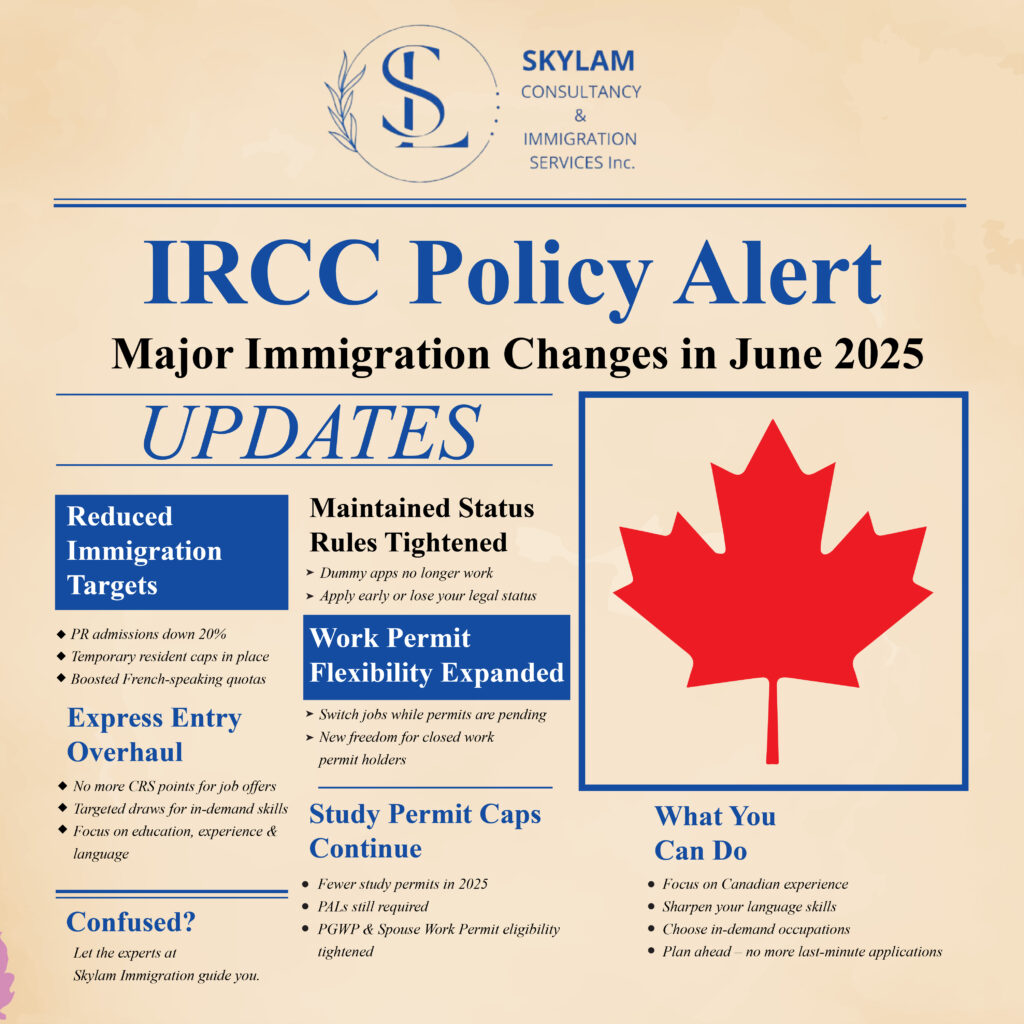 Published by Skylam Immigration | July 2025 Canada’s immigration landscape is experiencing its most significant transformation in recent years. Immigration, Refugees and Citizenship Canada (IRCC) has introduced sweeping policy changes throughout 2025, with major updates announced in June that will reshape the Canadian immigration system. At Skylam Immigration, we understand that navigating these changes can […]